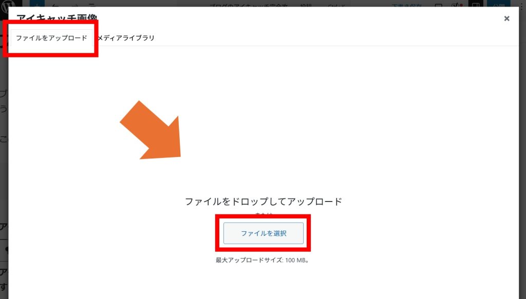 「ファイルをアップロード」タブで、「ファイルを選択」をクリック。開いた画面でアイキャッチ画像を選択する。