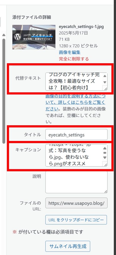 • キャプション → 記事の簡単な説明を入力する。