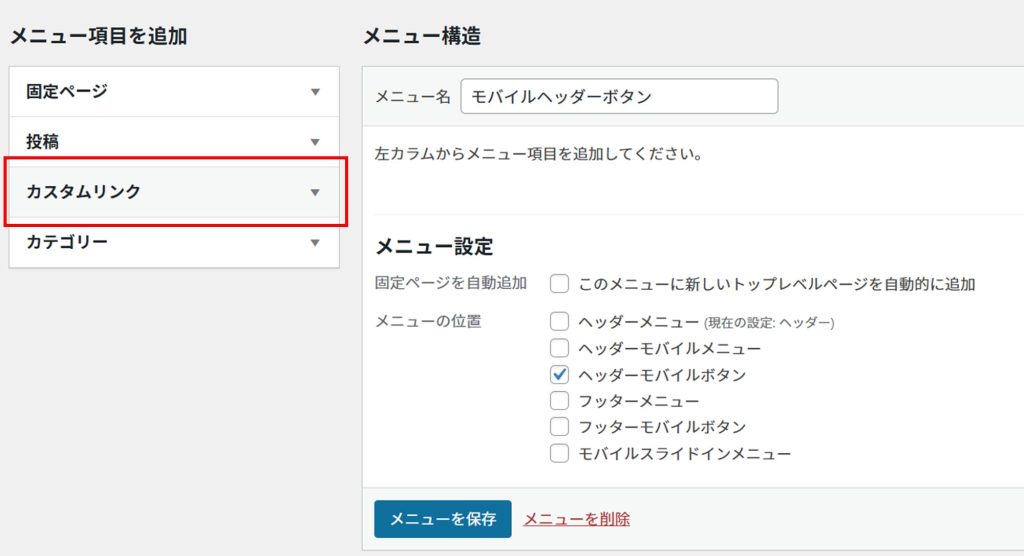 メニュー設定で「ヘッダーモバイルボタン」にチェックを付ける。