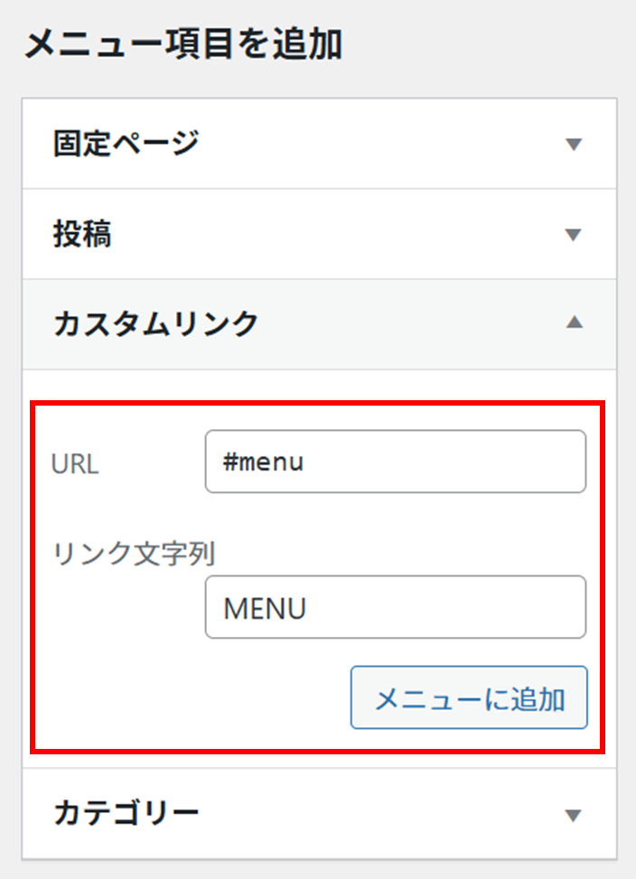 - STEP 06同様に、下記2つを入力。それぞれ「メニューに追加」をクリックする。