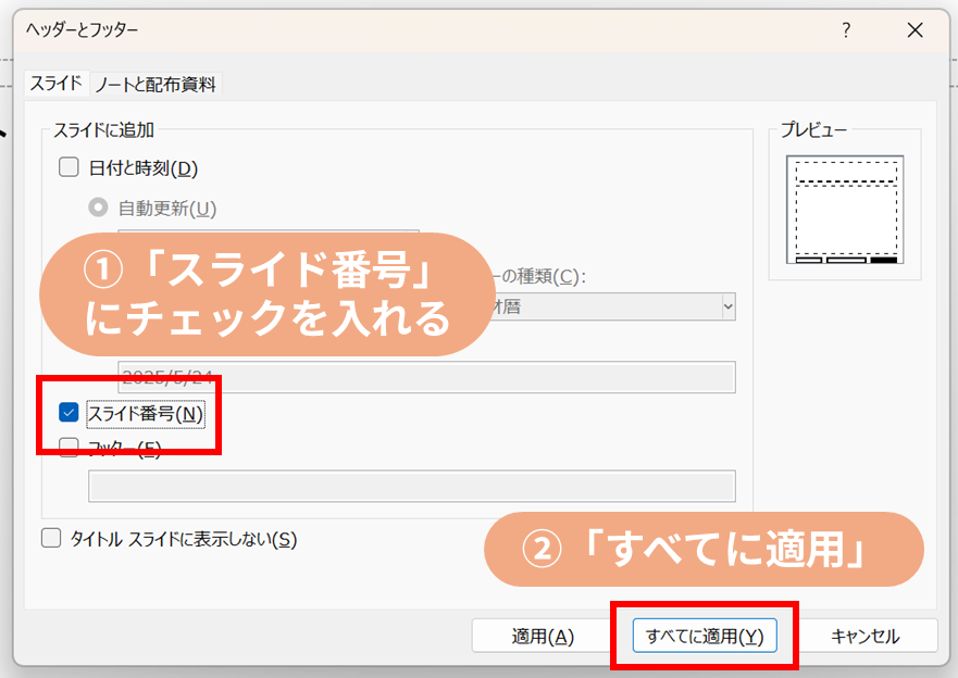 - STEP 03「スライド番号」にチェックを入れ、「すべてに適用」をクリックする。