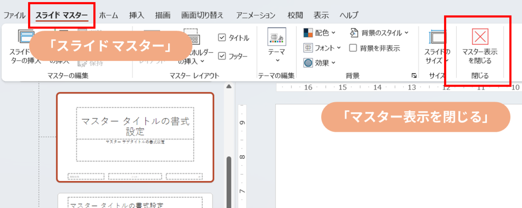 - STEP 05「マスター表示を閉じる」をクリックしてスライドマスターを閉じる。