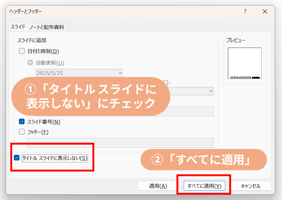- STEP 03「タイトル スライドに表示しない」にチェックを入れ、「すべてに適用」をクリック。