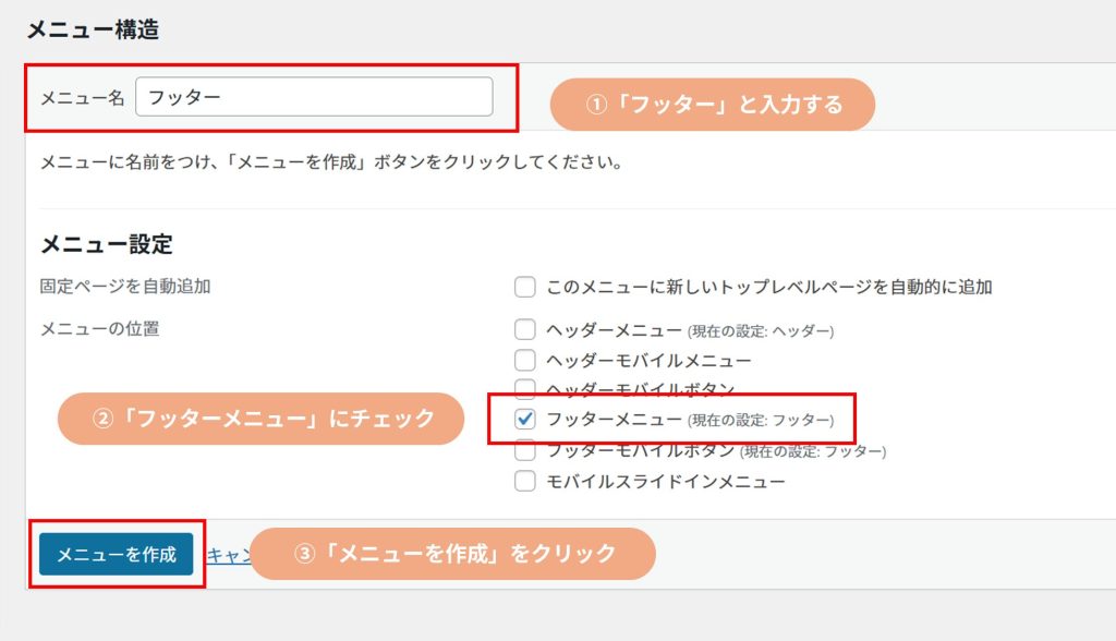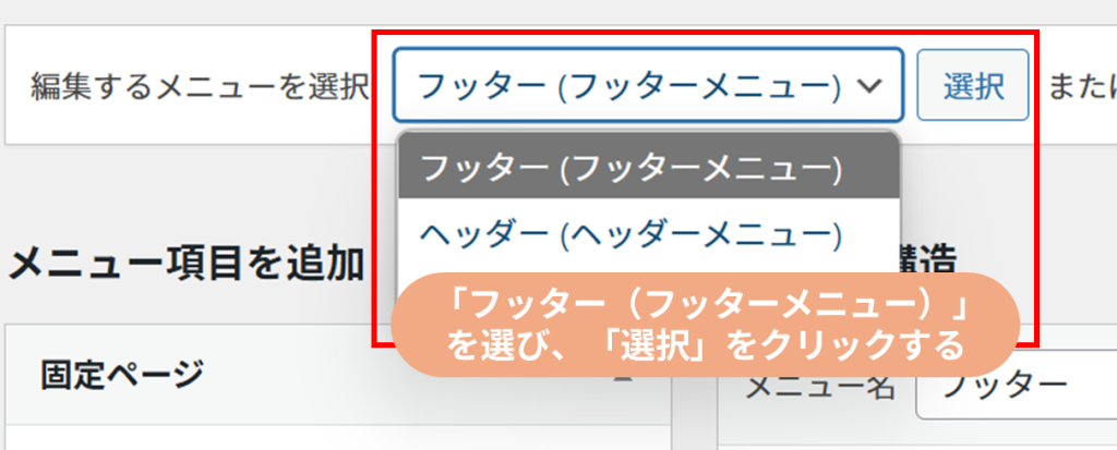 ※メニュー名は作成するときに入力したものなので、人によって違う。(フッターメニュー)と書かれているものを選択。