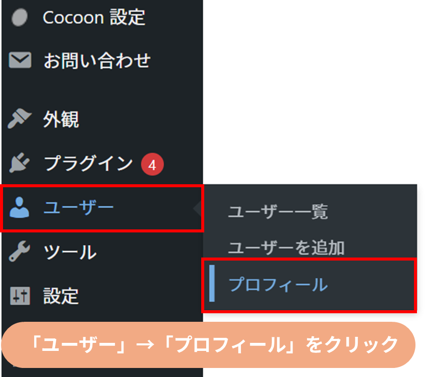 - STEP 01管理画面の「ユーザー」から「プロフィール」をクリックする。