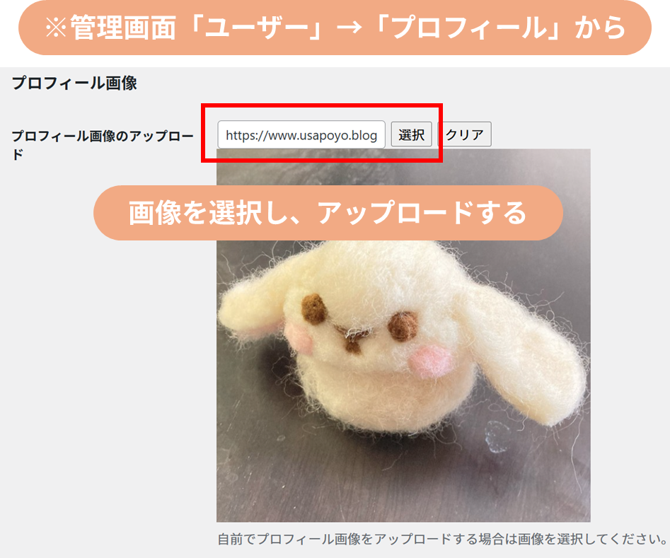 プロフィール画像を表示したい場合は、「ユーザー」→「プロフィール」(手順1/STEP01)から、「プロフィール画像」の項目で画像をアップロードする。