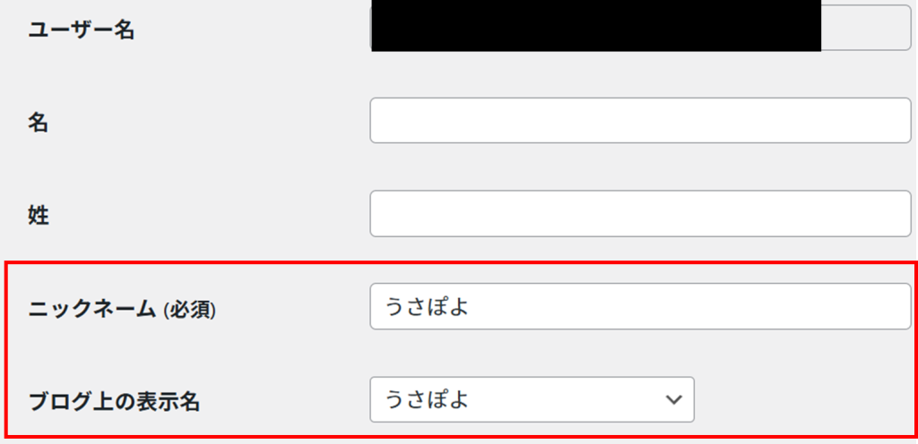 デフォルトでは、「ユーザー名」と「ニックネーム」、「ブログ上の表示名」は全て同じ名前になっている。