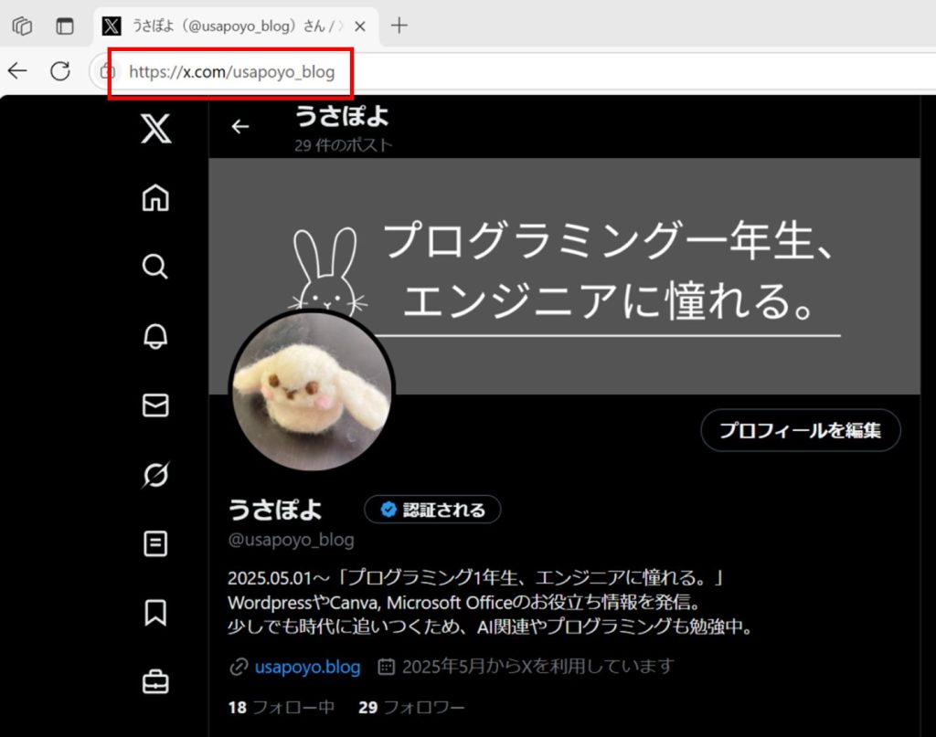 ここで追加するのは、Xのホーム画面のURLではなく、プロフィール画面のURL。
