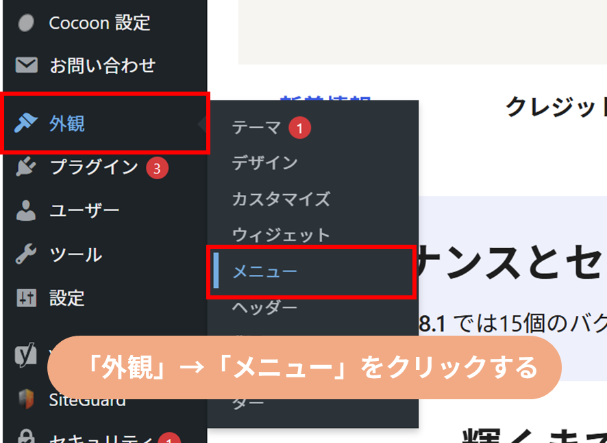 - STEP 01管理画面の「外観」から、「メニュー」をクリックする。