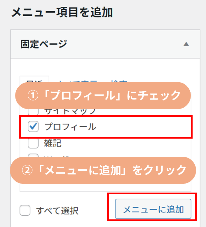 2. 「メニューに追加」をクリックする。※固定ページのタイトルを「プロフィール」以外にしていた場合はそのタイトルで表示される。